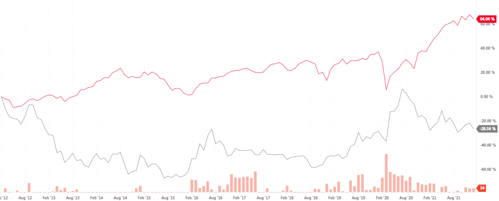 TSX Global Gold Index vs TSX Composite in the last 10 years