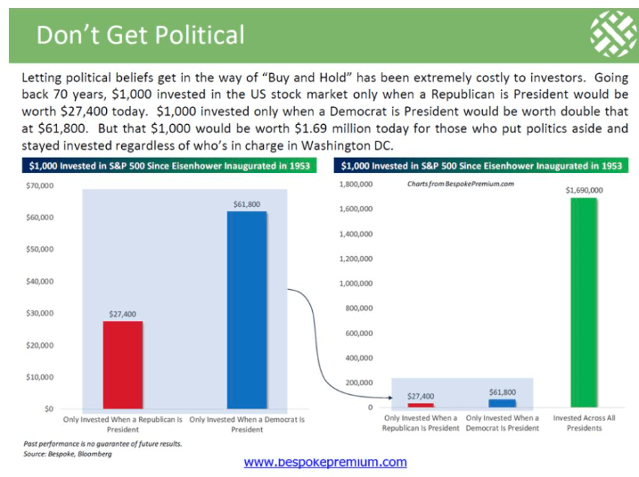 ראשית רואים שתחת נשיאים רפובליקנים, יגדלו אלף הדולר ל- $27,400, ותחת נשיאים דמוקרטים יגדלו אלף הדולר ל- $61,800. שנית נוכחים לדעת פעם נוספת כמה חשובה רציפות בהשקעה. במקרה זה צמחו אלף הדולר ל- $1,690,000. עם זאת, תמיד נמצאת ברקע אותה כוכבית עוכרת שמחות, שקל להתעלם מקיומה: * ביצועי העבר אינם ערובה לתוצאות בעתיד.