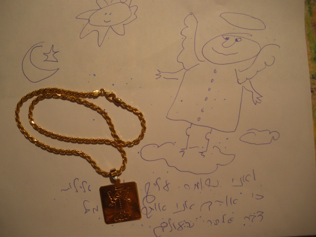 "אהבתי את [איור] המלאך ורציתי שהוא יהיה איתי תמיד". לצורך זה היא חיפשה ומצאה תכשיטן שחרט את האיור על לוחית דקה מזהב, ואף חיבר אליה שרשרת נאה. "בשנה האחרונה הורדתי את המדליון רק פעם אחת לצורך בדיקת ממוגרפיה. אני מאמינה שהוא שומר עלי מכל רע. אני רואה אותו בכל הצצה במראה ואני נוגעת בו הרבה".